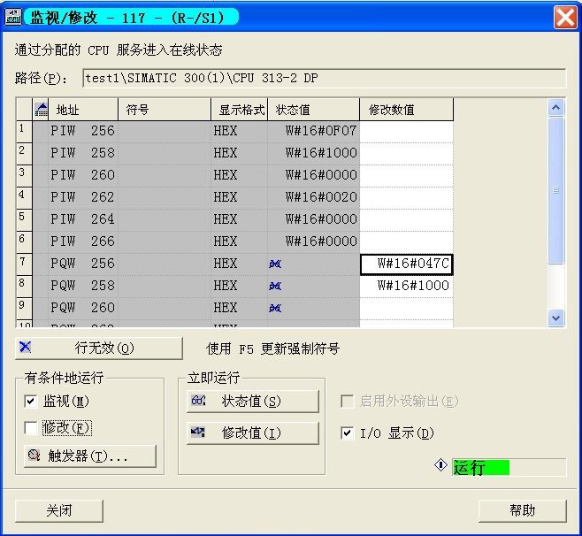 這時寫入 PCD1 控制字(示例中地址為 PQW 256) = W#16#047C(此控制字含義為“運 行”);寫入 PCD2 總線參考值(示例中地址為 PQW 258)= W#16#1000(含義為 25%),然 后按“修改值(I)”按鈕,數(shù)據(jù)就能傳送至變頻器,如果此時變頻器在 Auto-on 模式,控制 端子 12 與 27 短接,變頻器就能正常運行,而且輸出頻率為 12.5Hz。