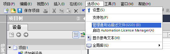 六、如果沒有安裝過 MCA102 的 GSD 文件,則需點(diǎn)擊‘選項(xiàng)’-‘安裝設(shè)備描述文件’, 操作如圖六所示。若已安裝則直接進(jìn)入第七步。