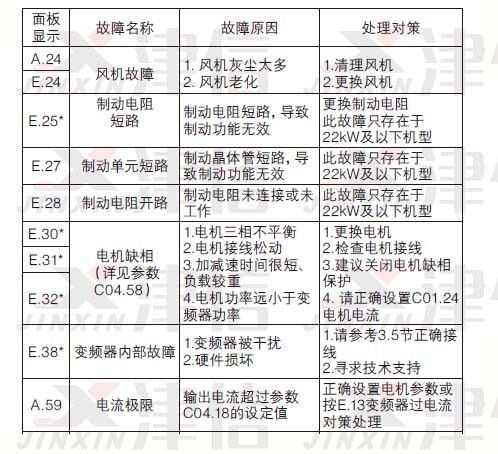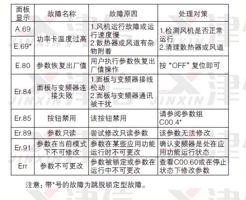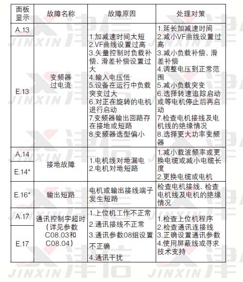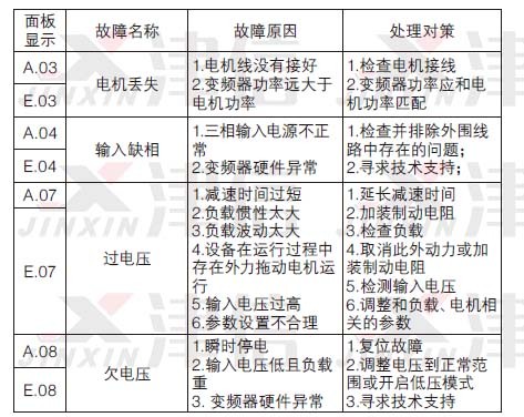 故障說明變頻器由于某種原因已經(jīng)超過設(shè)計極限,故障發(fā)生后變頻器跳脫,必須復(fù)位才能重新運行。故障產(chǎn)生時,面板顯示“E.XX”(XX指數(shù)字)。