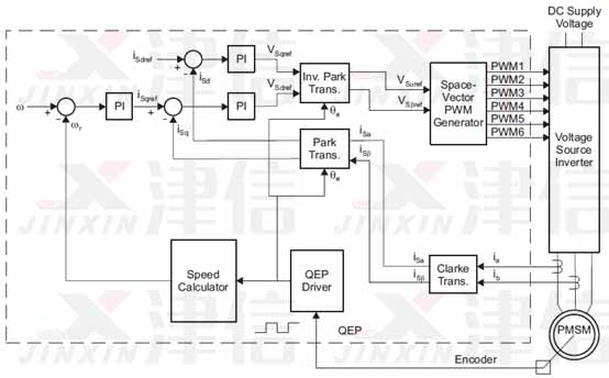 V/F方式是早期變頻器驅動永磁同步電機的控制方式之一,這種方式需要放大變頻器的功率,將永磁同步電機當作普通的交流異步電機,只做簡單的壓頻比控制。同時,對永磁同步電機的感應電勢波形要求較高,電機電流中含有不合理的磁場電流成分,無法體現出永磁同步電機高效節能的優勢,還容易造成失速、過流等問題,因此現在已經不推薦使用了。