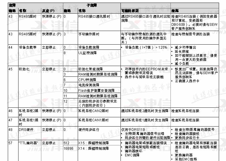 SEW變頻器故障代碼F43,F44,F45,F46,F47,F48,F57,具體如下: