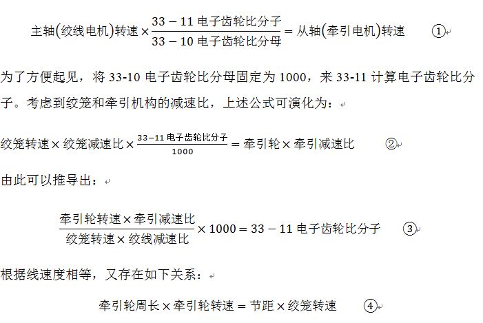 其中,絞籠轉速、節(jié)距由操作者給出,牽引輪周長、牽引減速比和絞線減速比取決于機械結構,由以上公式④推導出牽引輪轉速并帶入公式③,即可求出電子齒輪比分子,在計算的過程中須保證單位統(tǒng)一,計算出的電子齒輪比分子轉化為整數并通過FC協議寫入FC302的33-11參數。