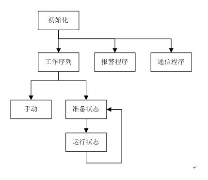 開機后,首先進行通信和狀態(tài)的初始化。初始化完成后同時調用工作序列、報警和通信子程序。工作序列中,包含手動和自動兩種狀態(tài),自動運行又包括機組準備(包括:松開機械抱閘、關閉防護門等動作)和機器運行兩個狀態(tài)。報警程序用于對機器狀態(tài)進行實時監(jiān)控,并根據故障情況執(zhí)行相關動作。通信程序用于PLC和變頻器的FC協議通信。