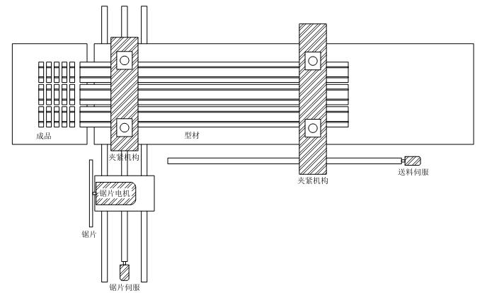 型材的長度可能達(dá)到數(shù)米,但送料絲桿的長度是有限的,因此需要采用往復(fù)式的送料方法,當(dāng)送料機(jī)構(gòu)的剩余進(jìn)給距離已經(jīng)不足以完成下次送料,送料機(jī)構(gòu)將自動退回到合適的位置,重新開始送料。