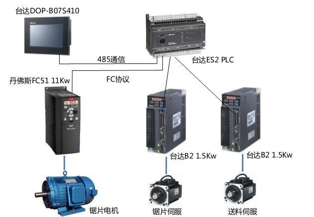 臺達(dá)ES2 PLC自帶兩組高速脈沖用于控制伺服,最高頻率到達(dá)100KHz,同時(shí)滿足了精度和速度的要求。ES2 PLC帶有兩組RS485通信口,分別與DOP-B07S410觸摸屏和FC51變頻器通信。