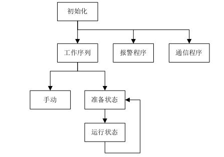 開機(jī)后,首先進(jìn)行通信和狀態(tài)的初始化。初始化完成后同時(shí)調(diào)用工作序列、報(bào)警和通信子程序。工作序列中,包含手動和自動兩種狀態(tài),自動運(yùn)行又包括單次鋸切和連續(xù)鋸切兩種工作模式。報(bào)警程序用于對機(jī)器狀態(tài)進(jìn)行實(shí)時(shí)監(jiān)控,并根據(jù)故障情況執(zhí)行相關(guān)動作。通信程序用于PLC和變頻器的FC協(xié)議通信,實(shí)現(xiàn)運(yùn)行狀態(tài)和報(bào)警信息的監(jiān)控。