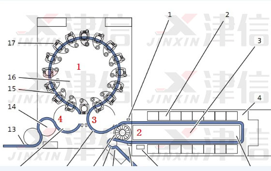 注:圖中機構(gòu)1為吹塑站,2為加熱爐,3為取胚機械手,4為取瓶機械手;