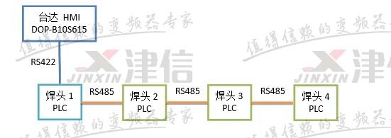 HMI和焊頭1的PLC之間采用三菱支持的RS422通訊,通訊速率可達(dá)115200bps。焊頭1的PLC和其它三個(gè)焊頭的PLC之間采用三菱PLC支持的N:N網(wǎng)絡(luò),通訊速率最高為19200bps。